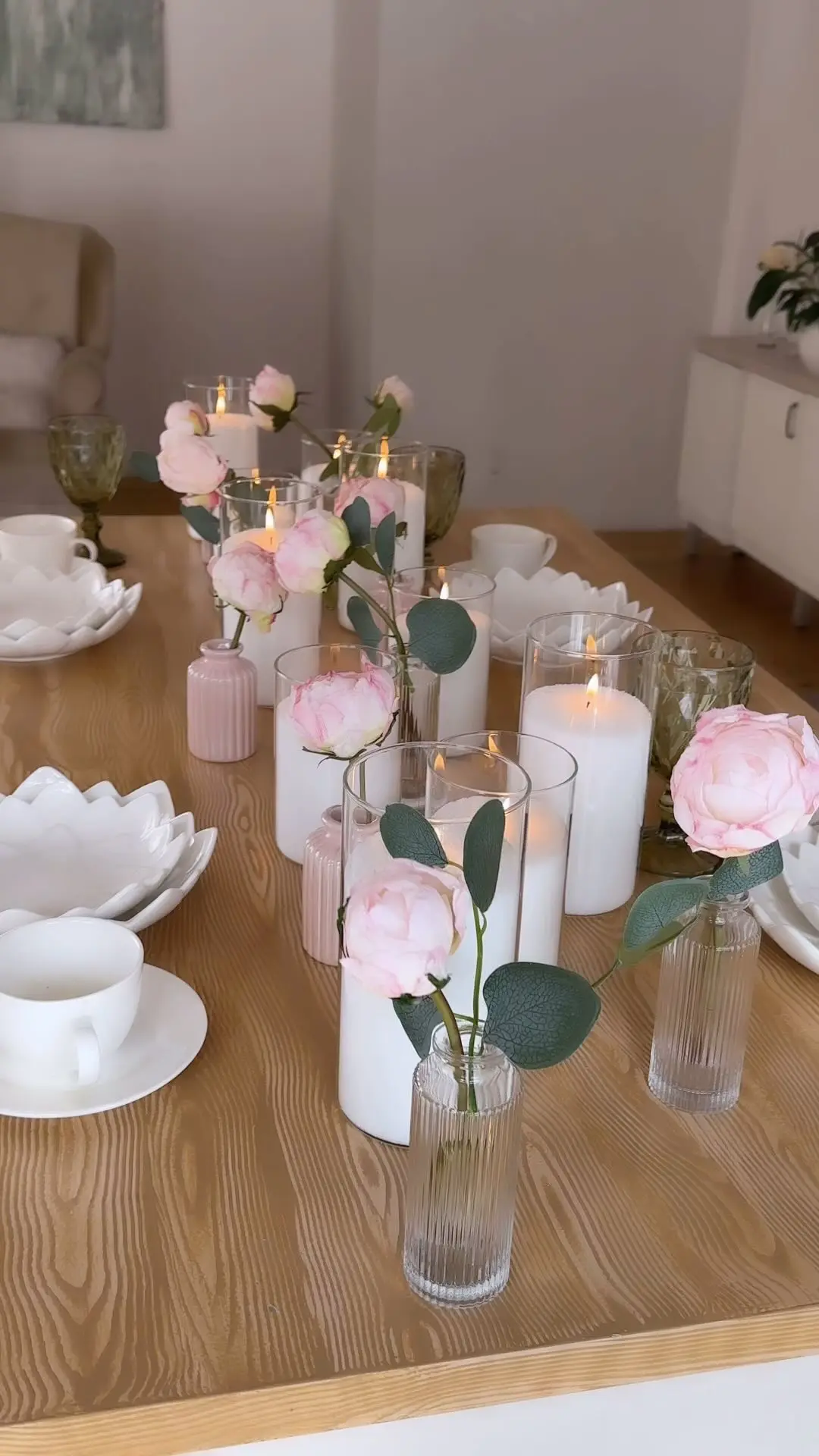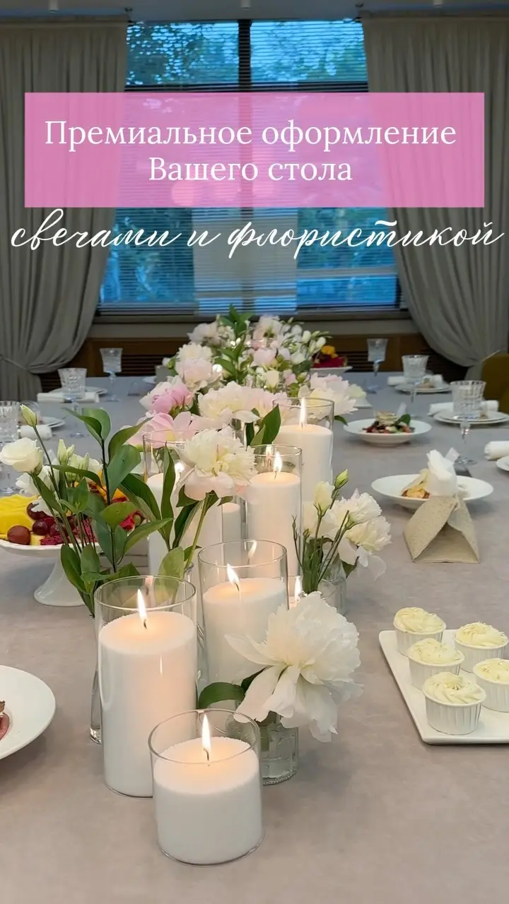 Декор стола столовыми свечами создает уютную и элегантную атмосферу.
